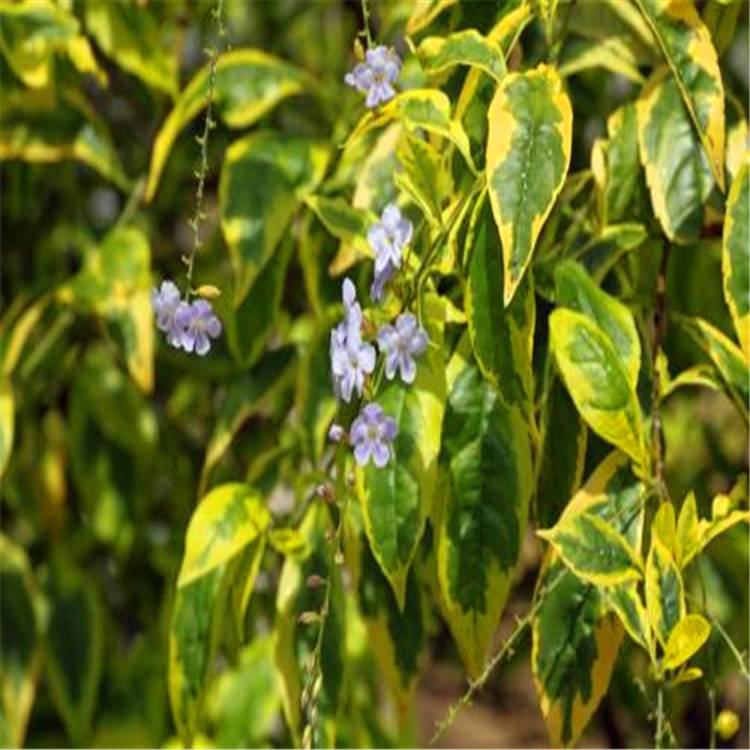 花叶假连翘(学名:Duranta erecta 'Golden Edge')是马鞭草科、假连翘属多年生灌木,茎高可达4米左右。多分枝,叶对生,卵形,先端为尖形,边缘有锯齿,叶面边缘有乳白色斑纹,中部为浓绿色。叶腋间有长刺,一般不明显。花为高脚蝶状,花冠蓝紫色,果为圆形或近卵形,顶端喙尖。总状果序,橘红色或金黄色,有光泽。
