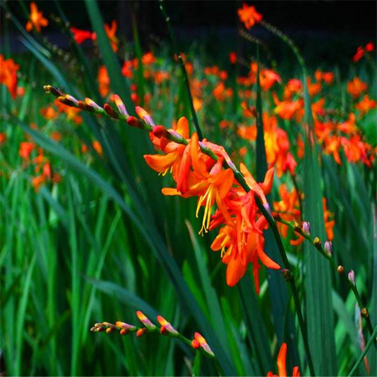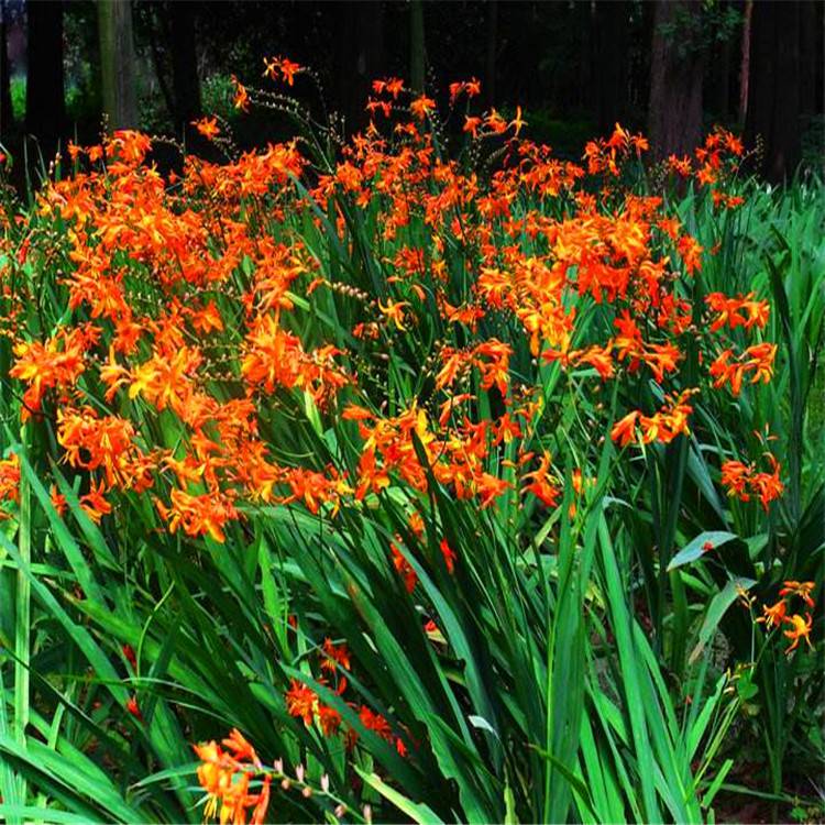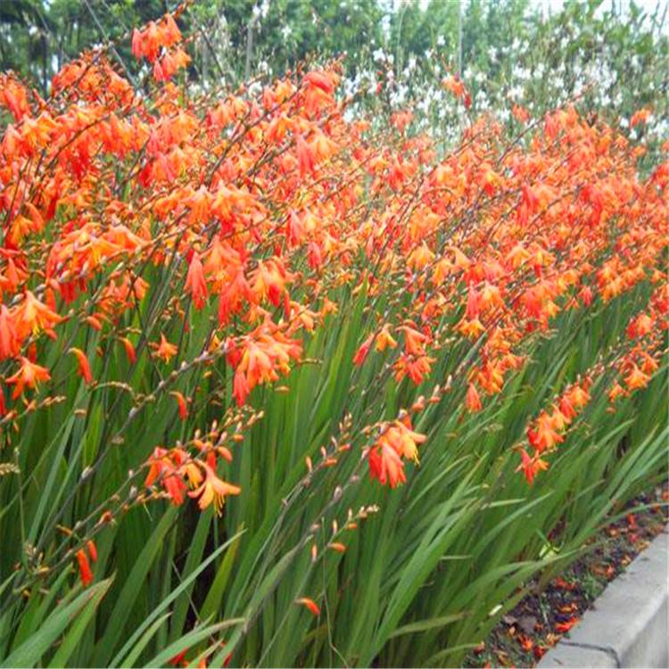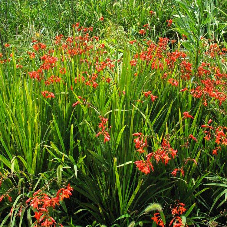 多年生草本,有球茎和匍匐茎,球茎扁圆形似荸荠,外有褐色纤维质膜。地上茎高约50㎝,常有分枝。叶线状剑形,基部有叶鞘抱茎而生。花多数,排列成复圆锥花序,从葱绿的叶丛中抽出,高低错落,疏密有致。花漏斗形,橙红色,园艺品种有红、橙、黄三色;花被筒细而略弯曲,裂片开展。蒴果,内有种子数粒。