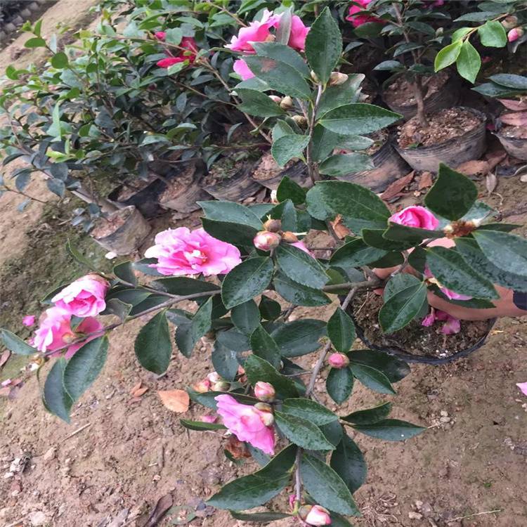 该种叶似茶,花如梅而得名。茶梅,体态秀丽、叶形雅致、花色艳丽、花期长(自11月初开至翌年3 月),树型娇小、枝条开放、分枝低、易修剪造型,适宜盆栽、庭院、阳台、宾馆等理想的盆栽名花。