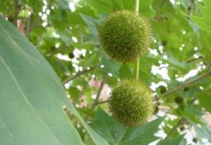 【特性】落叶乔木。株高 10~20 公尺,树皮乳光滑,片状剥落;嫩枝有黄褐色绒毛;老枝光滑,红褐色。叶大,阔卵形,宽 10~22 公分,长 10~21 公分, 3~5 裂至中部,长比宽略短,基部截形、阔心形或稍呈楔形,裂片宽三角形,边缘有数个粗大锯齿,上下两面幼时被灰黄色绒毛,后 变无毛;叶柄长 3~10 公分,密被黄褐色绒毛;托叶长 1~1.5 公分,基部鞘状,上部开裂。花小,单性同株,成球形头状花序;雄花 4,比花瓣长,盾状药隔有毛;雌花约 6 个心皮,离生,花柱长 0.2~0.3 公分。果枝有球形果序,通长 2 个,常下垂,直径约 2.5~3.5 公分。小坚果长约 0.9 公分,基部有长毛。花期 5 月,果期 9~10 月。